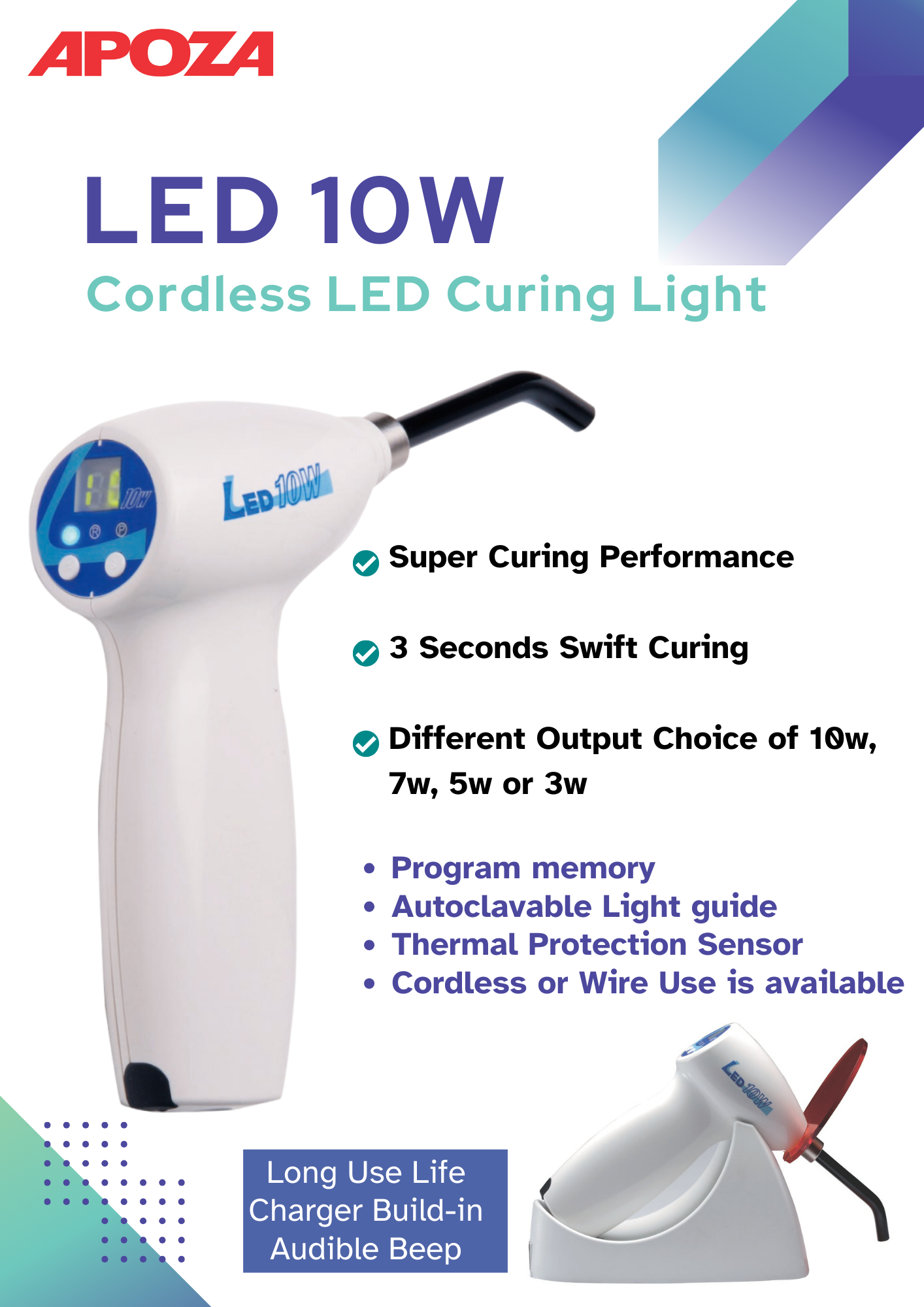 The LED 10W Dental Curing Light incorporates the very latest 10W output LED curing light technology to provide the most rapid, efficient and stable curing performance.